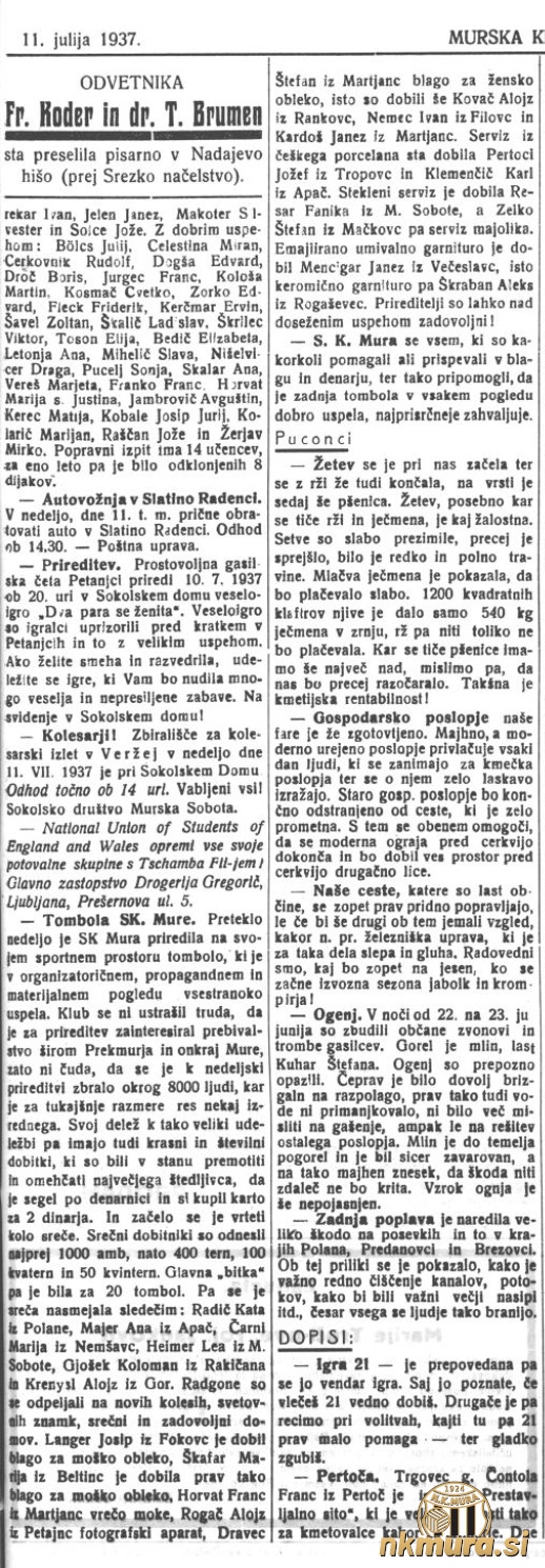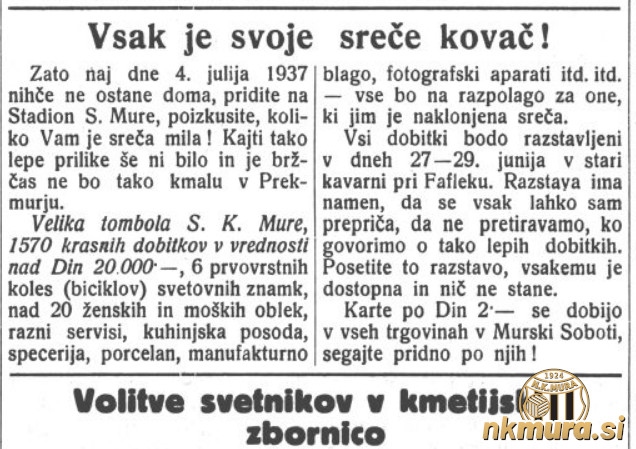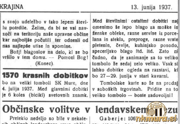 Mura je v nedeljo, 4. julija 1937, priredila svojo drugo tombolo. V nasprotju s prvo, ki je bila pri soboškem gradu leta 1935, je bila ta organizirana na novem stadionu Mure. Pričela se je ob 14.30.