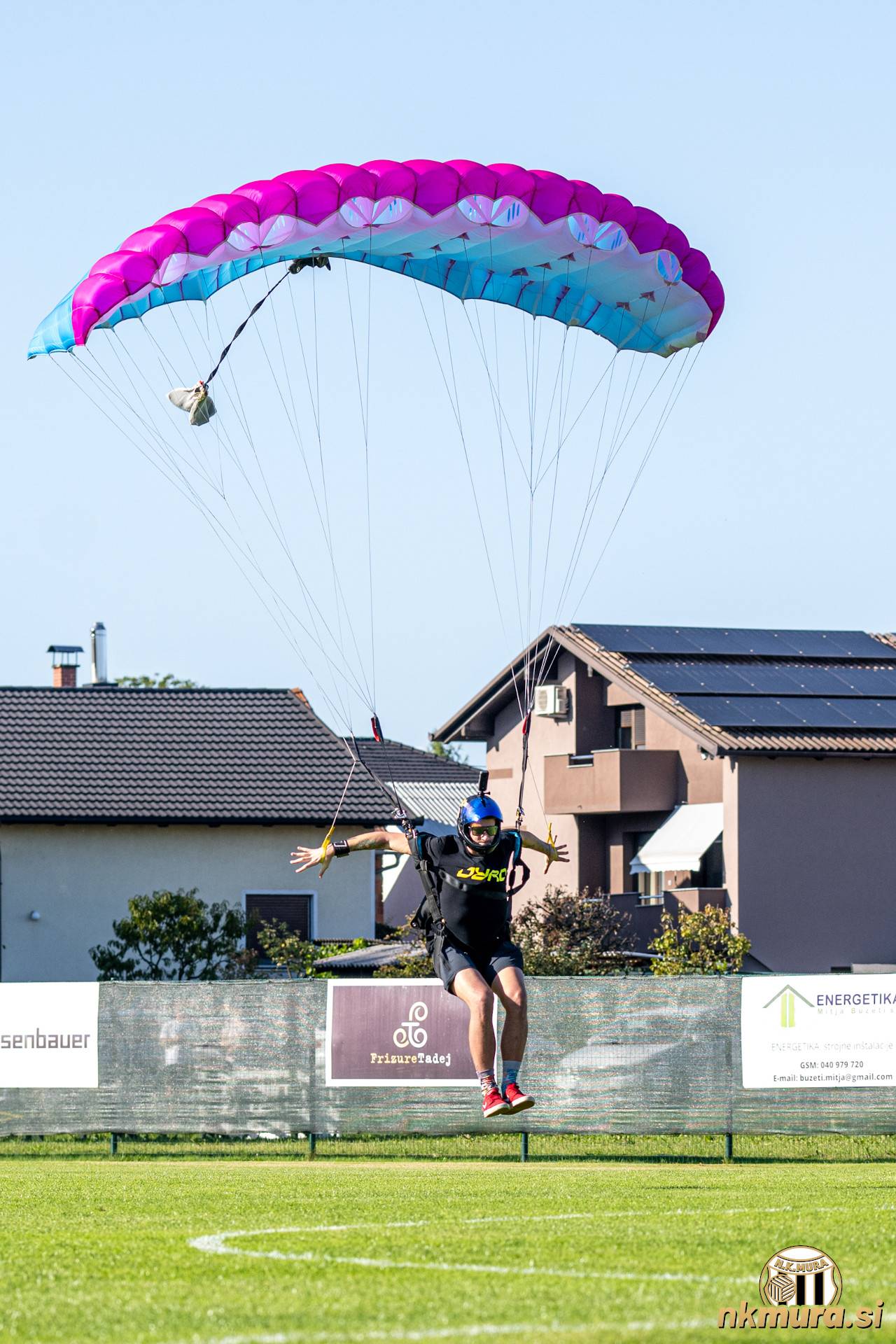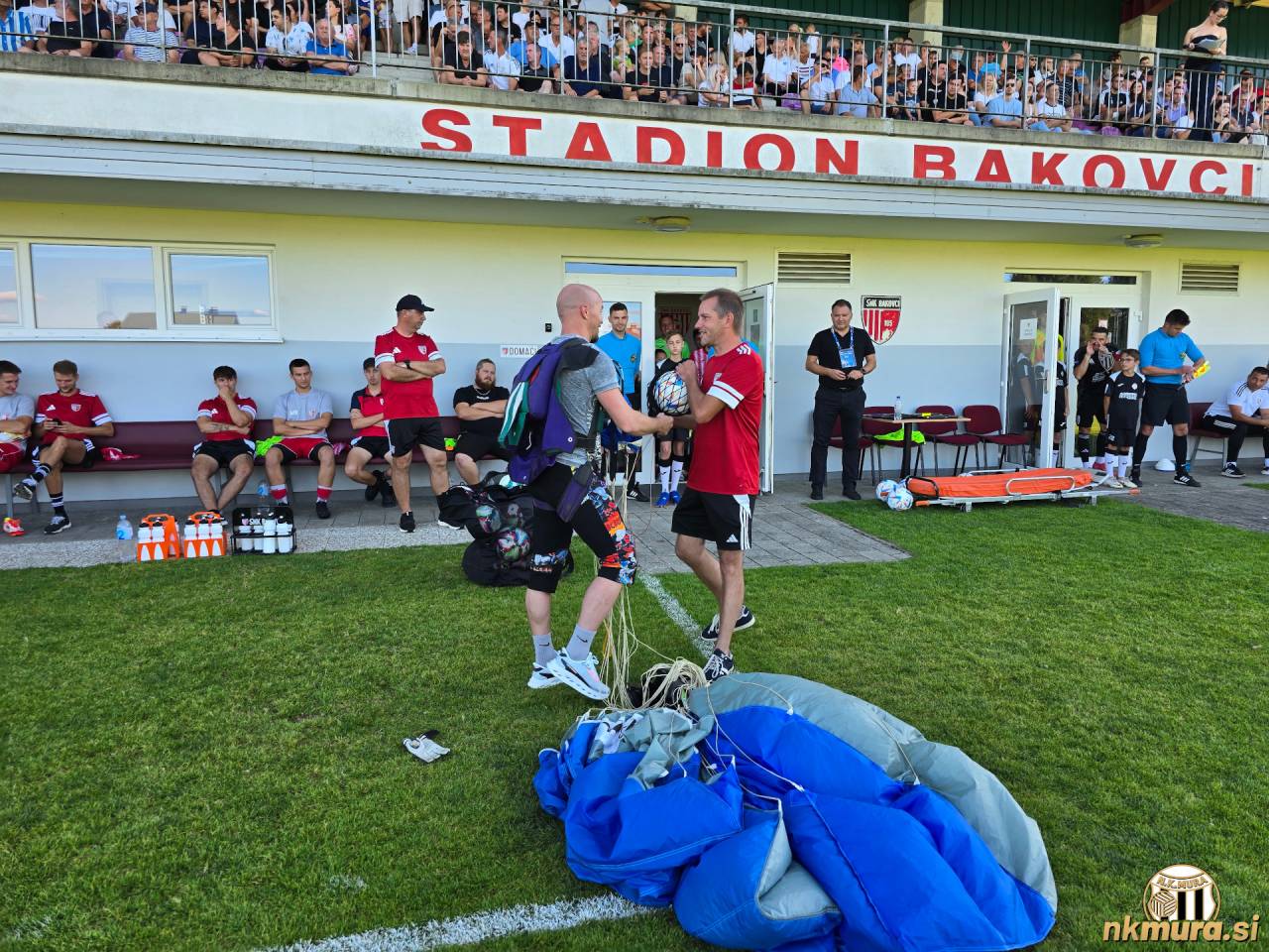Denis Žilavec je pred pričetkom tekme skočil s padalom in prinesel žogo s katero so igrali tekmo. Avtorske pravice: nkmura.si Foto: Simon Horvat