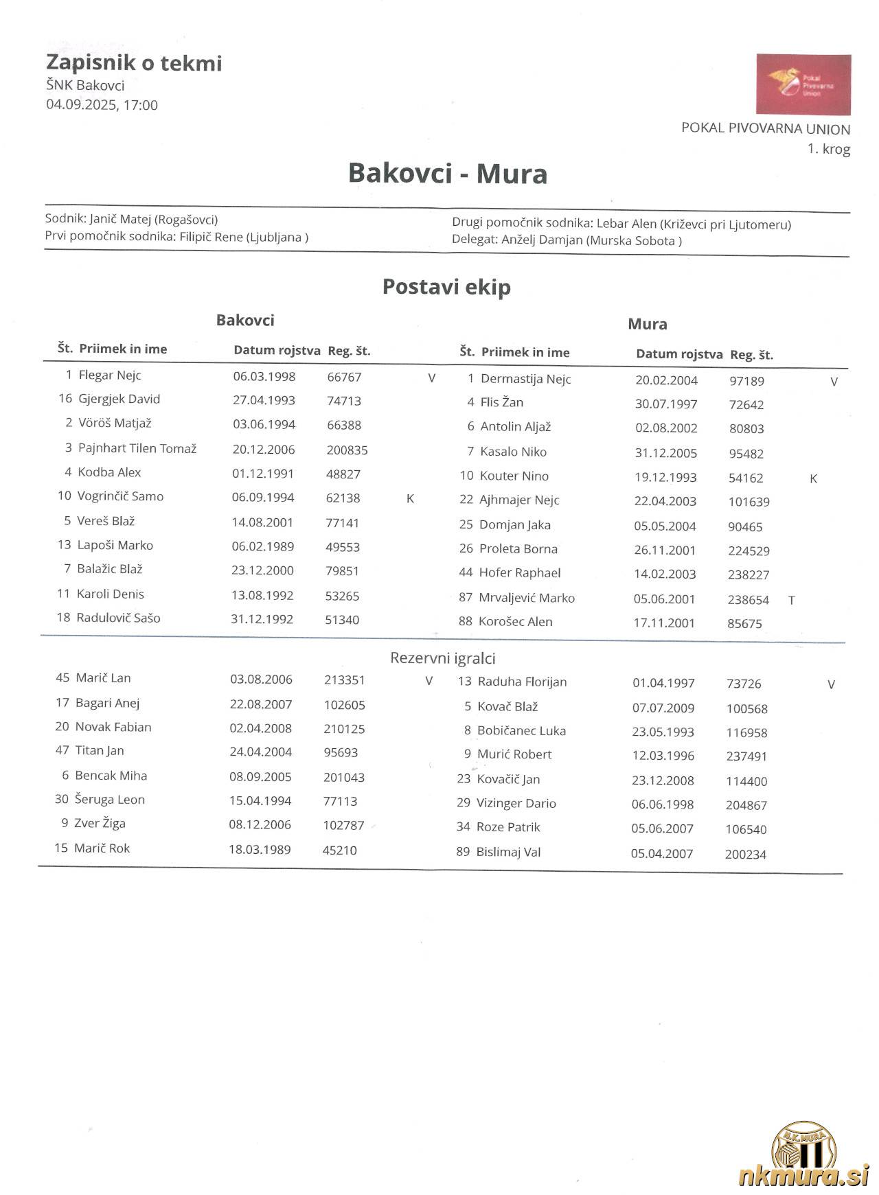 Zapisnik s tekme. Avtorske pravice: nkmura.si Foto: arhiv NK Mura skozi čas