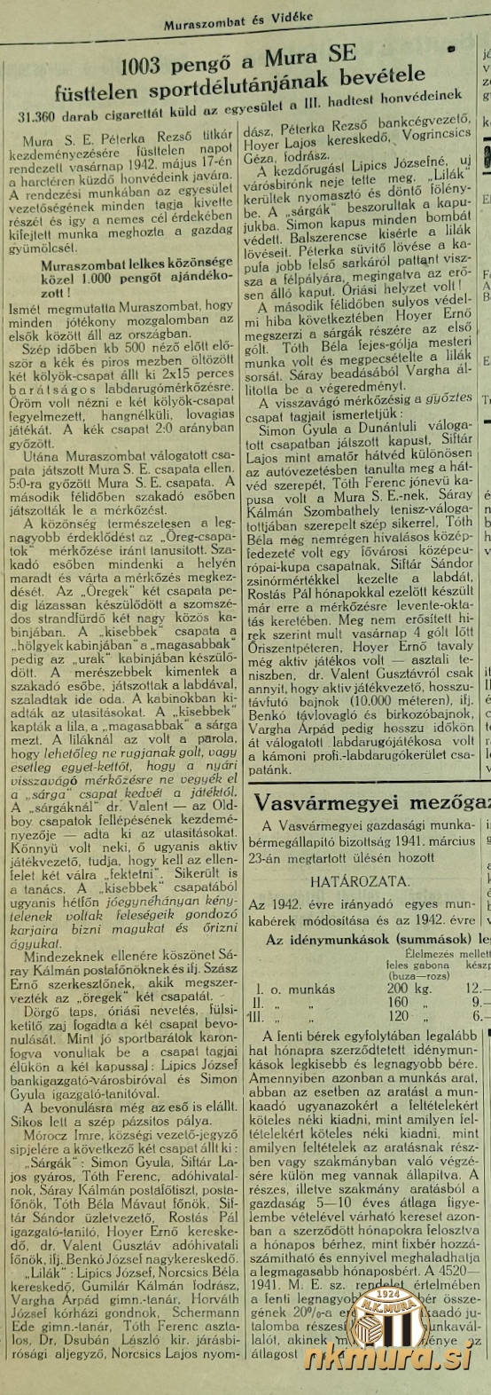 Mura je v nedeljo, 17. maja 1942, na pobudo tajnika kluba Raoula Peterke, organizirala t.i. brezdimni dan. Zaznamovale so ga športne prireditve, na njem pa so zbirali denarna sredstva za nakup cigaret, ki si jih nato poslali vojakom na bojišča. Na prireditvi so zbrali 1003 pengőv kar je bilo dovolj za 31.360 cigaret.