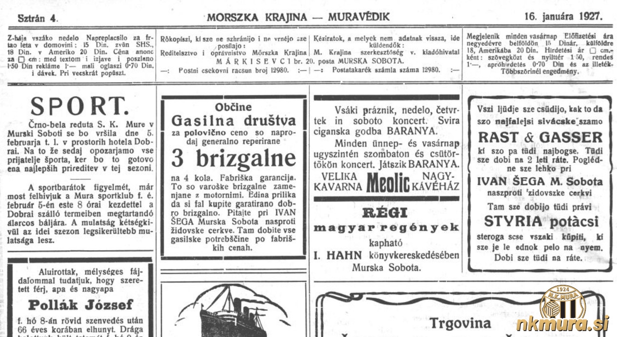 Športni klub Mura je 5. februarja 1927 ob 20.00 organiziral črno-belo reduto. Potekala je v hotelu Dobrai. Reduta je pustno rajanje v maskah.
