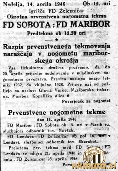 Nogometaši Sobote so se v prvenstveni tekmi mariborskega telesnovzgojnega okrožja pomerila z Mariborom in izgubili s 3:0. Domačini so na stadionu Železničarja vodili že ob polčasu, ko je bilo 1:0.