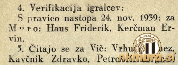 Nogometno moštvo Mure sta okrepila Ervin Kerčmar in Friderik Haus. Verificirana sta bila 14. novembra 1939, pravico nastopa pa imata od 24. novembra 1939 naprej.