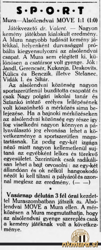 Mura je na tekmi pokazala več tehničnega znanja, domačini pa so to poskušali preprečiti s trdo in nesramno igro. Zelo nešportno se je obnašala tudi lendavska publika in po posredovanju Lendavčanov učitelja civilne šole Nagyja in skrbnika Stanka je bila tekma uspešno izpeljana do konca. Kot poročajo mediji je težavo z lendavsko publiko mogoče rešiti le radikalno in odstraniti problematičen del publike, saj bi v nasprotnem primeru Lendavi lahko grozilo neigranje tekem na domačih tleh.