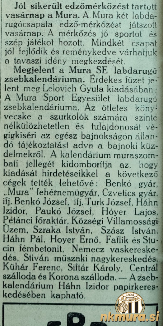 Mura S.E. je v teh dneh izdala žepni nogometni koledar. Domiselna knjiga je nepogrešljiv pripomoček vsakega navijača, saj lahko v njej najdemo vse potrebne informacije o prvenstvenih tekmah Mure v sezoni 1943/44. Izšla je pri založbi Gyula Lelovics na voljo pa je v trgovini Izidorja Hahna v Murski Soboti.