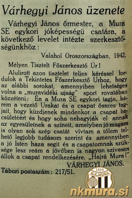 Janez Varhegyi, ki je bil v pravkar končani sezoni 1941/42 eden izmed boljših igralcev Mure in igralec, ki je dosegel veliko zadetkov, zaključuje svojo športno pot pri Muri. V časniku Muraszombat és vidéke je bilo objavljeno njegovo poslovilno pismo: