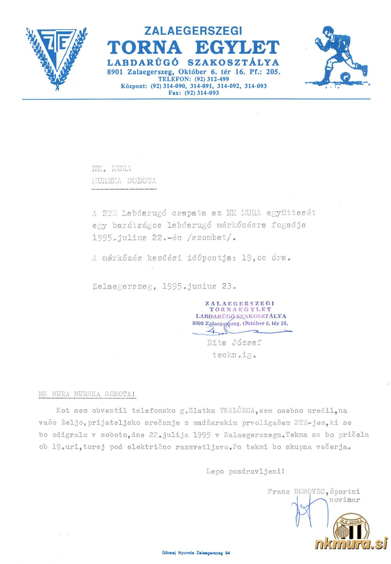 Dopis iz katerega je razvidno, da sta se Mura in ZTE dogovorila za pripravljalno tekmo. Avtorske pravice: nkmura.si Foto: arhiv Franca Bobovca