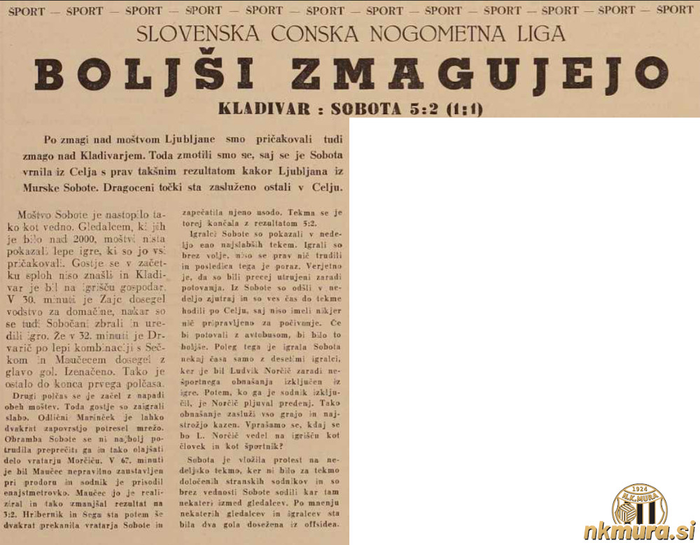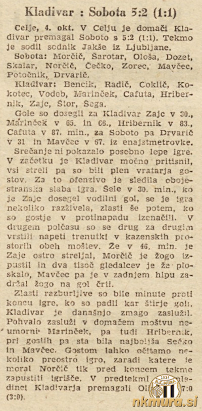 Sobočani so v 5. krogu slovenske conske lige gostovali v Celju kjer so merili moči s Kladivarjem. Po vzpodbudnem prvem polčasu, ki se je končal 1:1, so naši nogometaši v drugem popustili in domačini so zmagali s 5:2. Sobota se nahaja na osemem mestu med dvanajstimi ekipami.