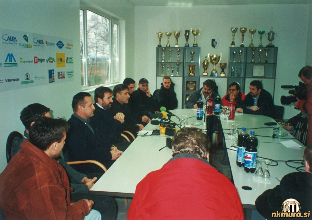 Novinarska konferenca ob predstavitvi Luke Bonačića. V sredini (tretji z leve) je predsednik Tugomir FRajman, zraven njega je član UO Geza Farkaš, sledi pa Luka Bonačić. Novinarska konferenca je potekala v klubskih prostorih na glavni tribuni. Avtorske pravice: nkmura.si Foto: Franc Bobovec