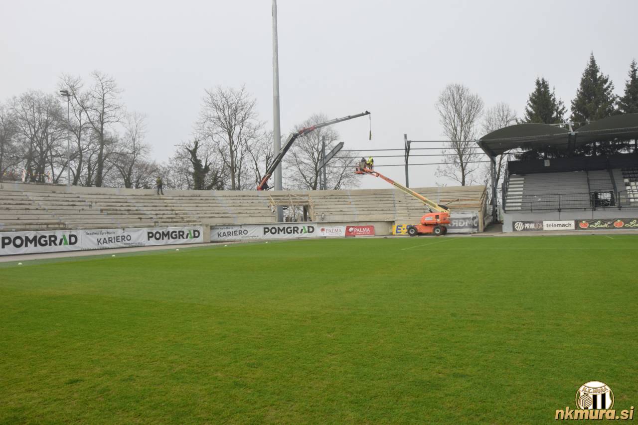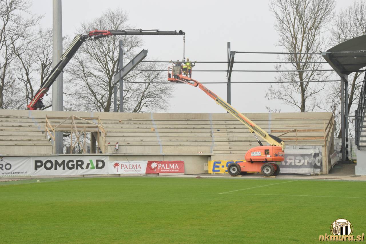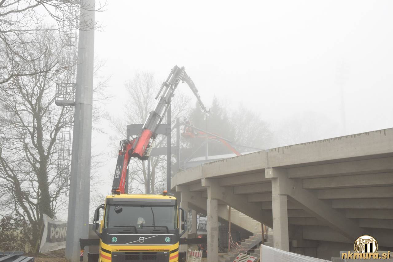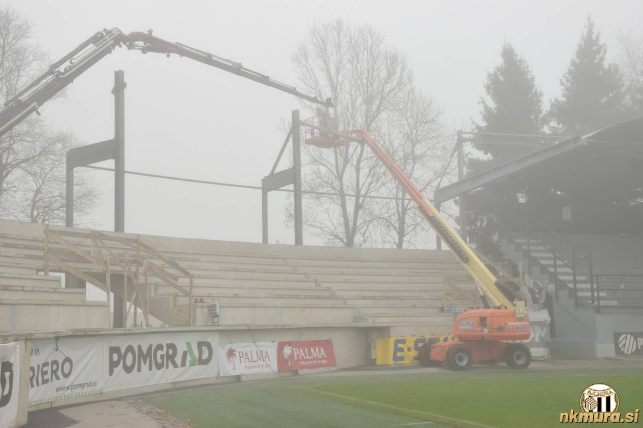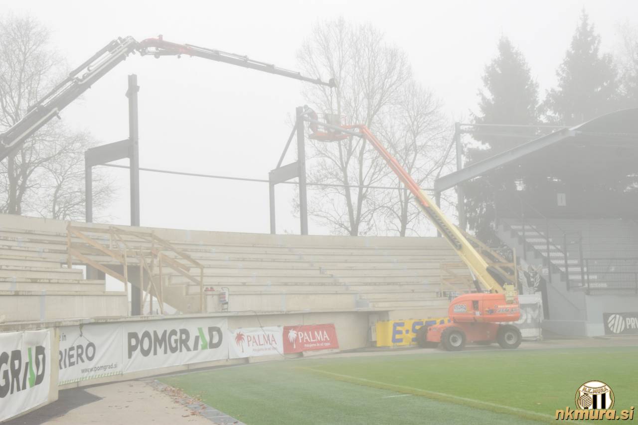 Danes je drugi dan odkar delavci postavljajo streho na novozgrajeni severozahodni tribuni. Nad Mursko Soboto se cel dan vije megla, ki pa dela ne ovira. Trenutno stanje si lahko ogledate na spodnjih fotografijah.