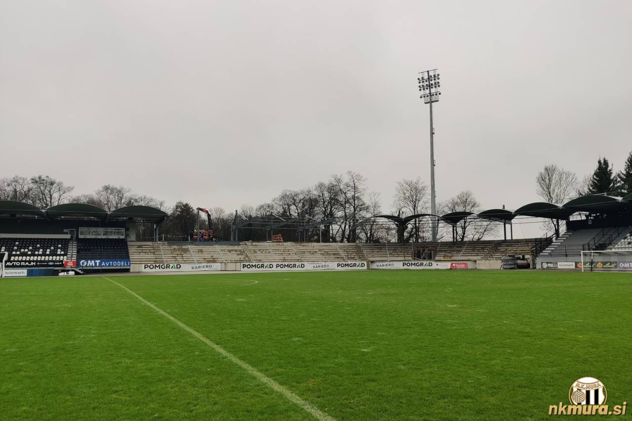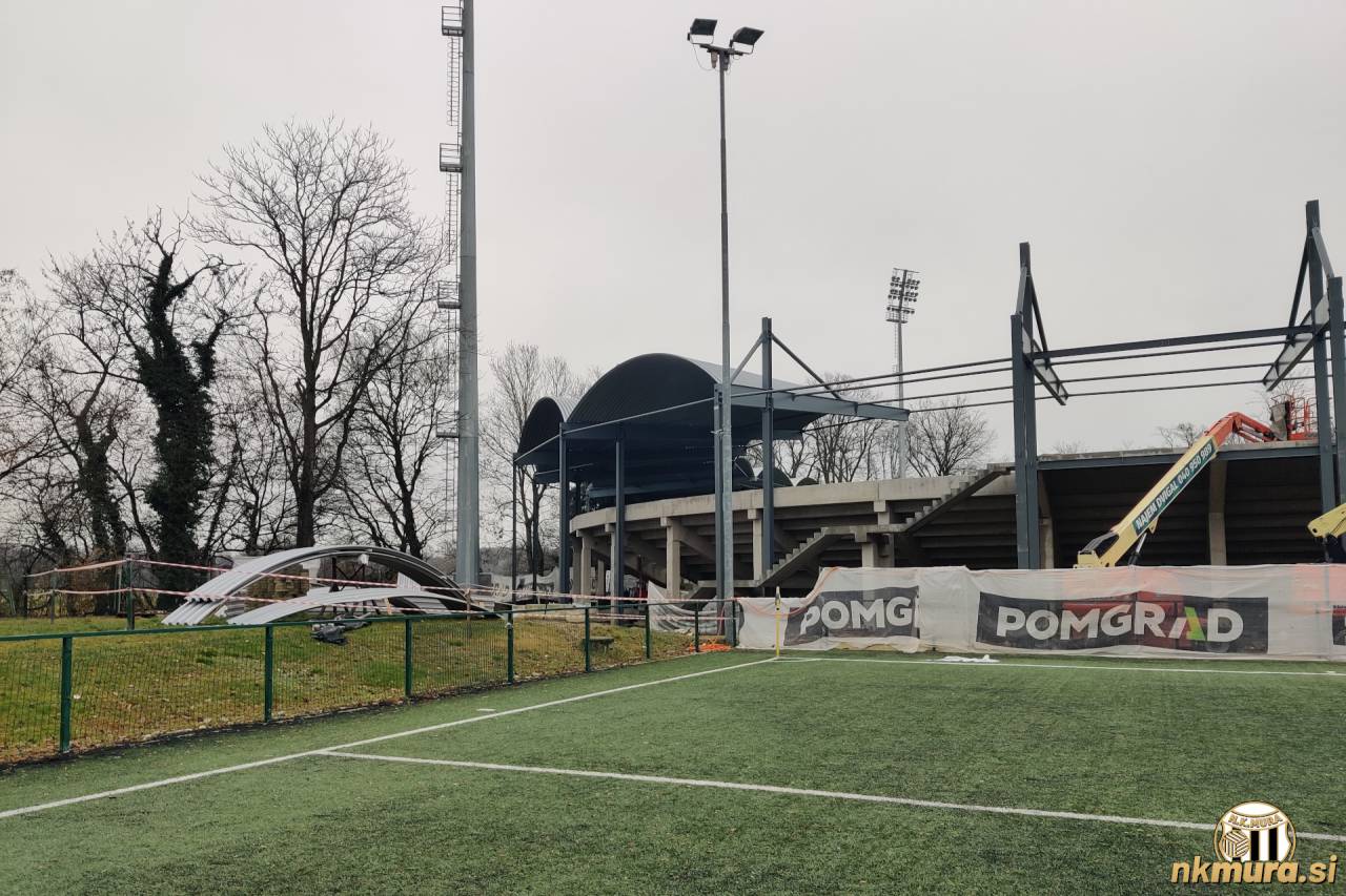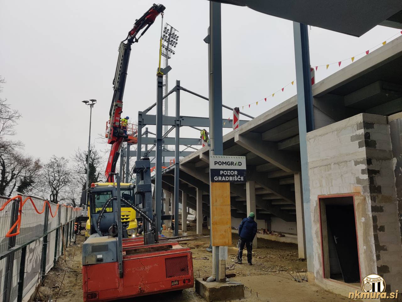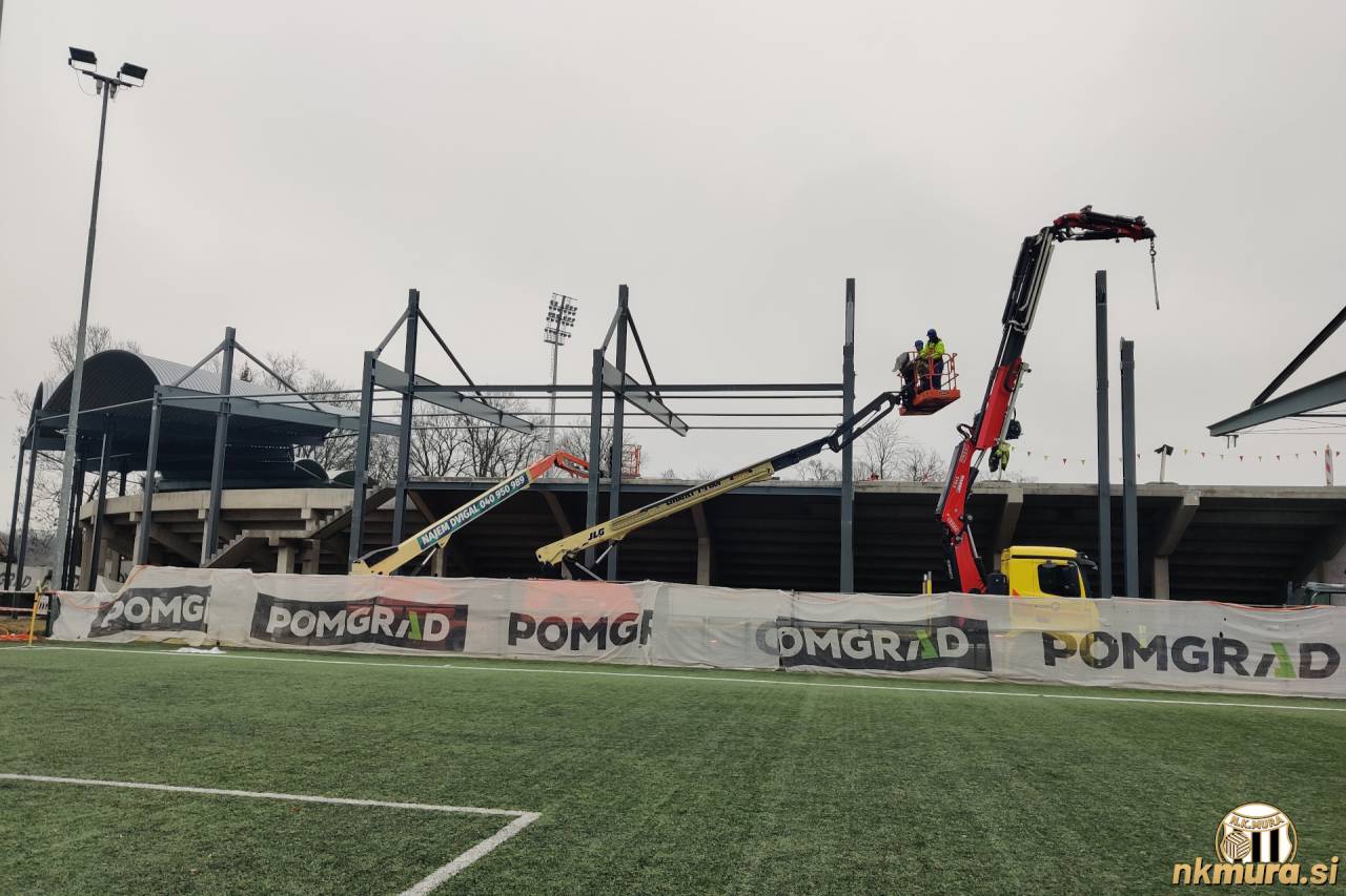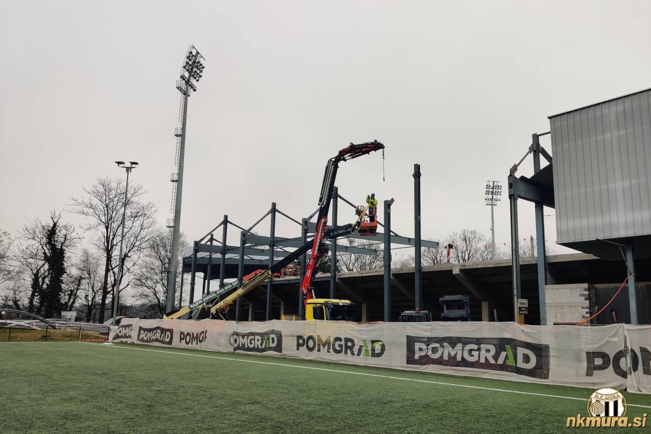Še naprej spremljamo montažo strehe na novi tribuni. Danes so postavili nosilne stebre do glavne tribune, tako da je ostala le še streha, ki jo bodo zmontirali v prihodnjih dneh. Delavce še naprej spremlja izredno slabo vreme, saj je Prekmurje že nekaj tednov prekrito z gosto meglo.