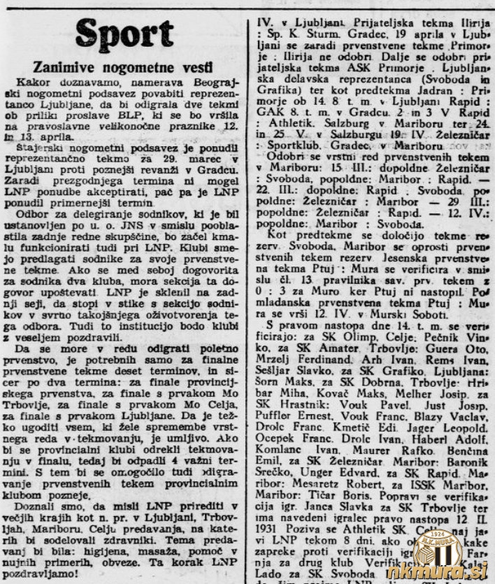 Nogometaši Mure bi morali 21. septembra 1930 igrati prvenstveno nogometno tekmo na Ptuju z istoimenskim klubom. Ker domačin ni nastopil je vodstvo tekmovanja določilo zmago Mure z 0:3.