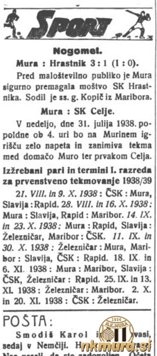 24. julija 1938 sta se v prijateljski nogometni tekmi pomerila Mura in Hrastnik. Po devetdesetih minutah je bila boljša Mura s 3:1 (1:0). Hrastnik bo v sezoni 1938/1939 tekmoval v II. razredu Celjske skupine.