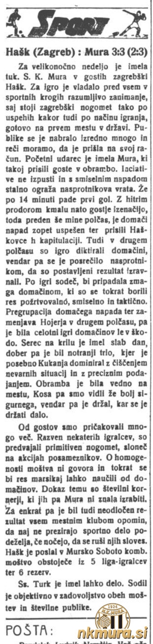 Ne velikonočno nedeljo, 17. aprila 1938, je Mura v Murski Soboti gostila kombinirano ekipo Zagrebškega HAŠK-a. Ob rekordnem številu gledalcev, zbralo se jih je kar 1500, se je tekma končala brez zmagovalca 3:3 (3:2).