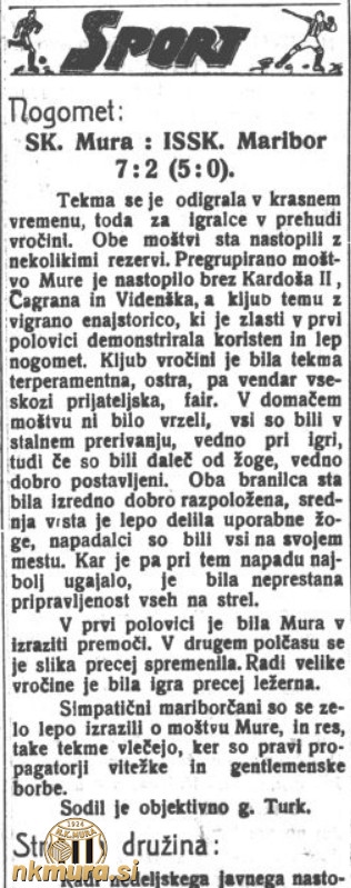 V prvi prijateljski tekmi v sezoni 1935/1936, so se črno-beli pomerili s starimi rivali iz Maribora in zmagali s 7:2 (5:0). Obe ekipi, tako Mura kot I.SSK Maribor sta nastopili v kombinirani postavi. Pri Muri so manjkali Kardoš II (Jeno Kardoš), Čagran in Videnšek. Kljub temu so črno-beli igrali dokaj kombinatorno in demonstrirali lep nogomet.
