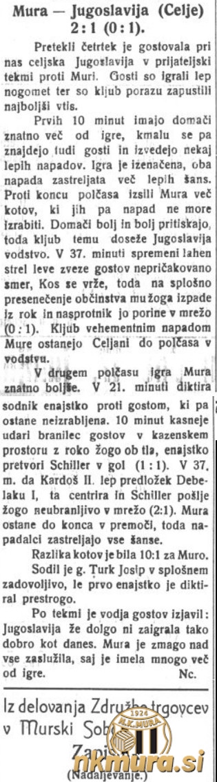 V četrtek, 31. maja 1934 je v Murski Sobota gostovala celjska Jugoslavija. V prijateljski tekmi so jih črno-beli premagali z 2:1 (0:1).