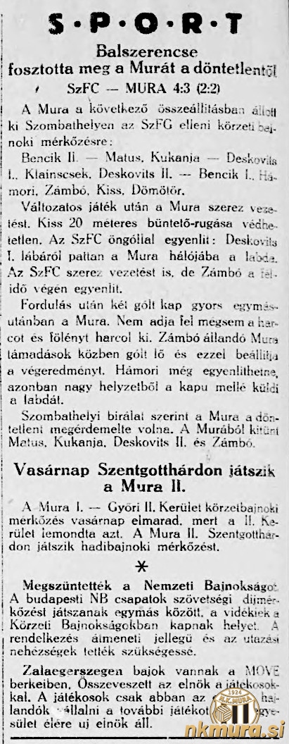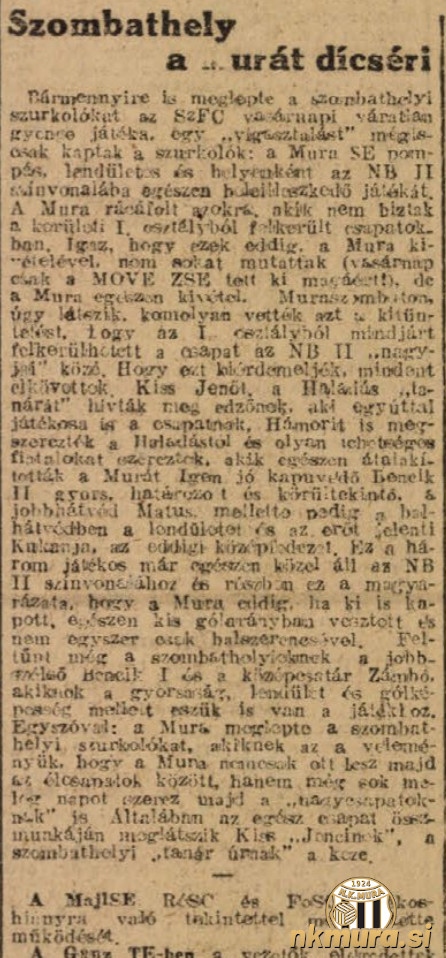 V 5. krogu prvenstva v 2. madžarski ligi je Mura gostovala v Sombotelu pri ekipi Szombathelyi FC ter izgubila s 4:3. Ob polčasu je bilo 2:2.