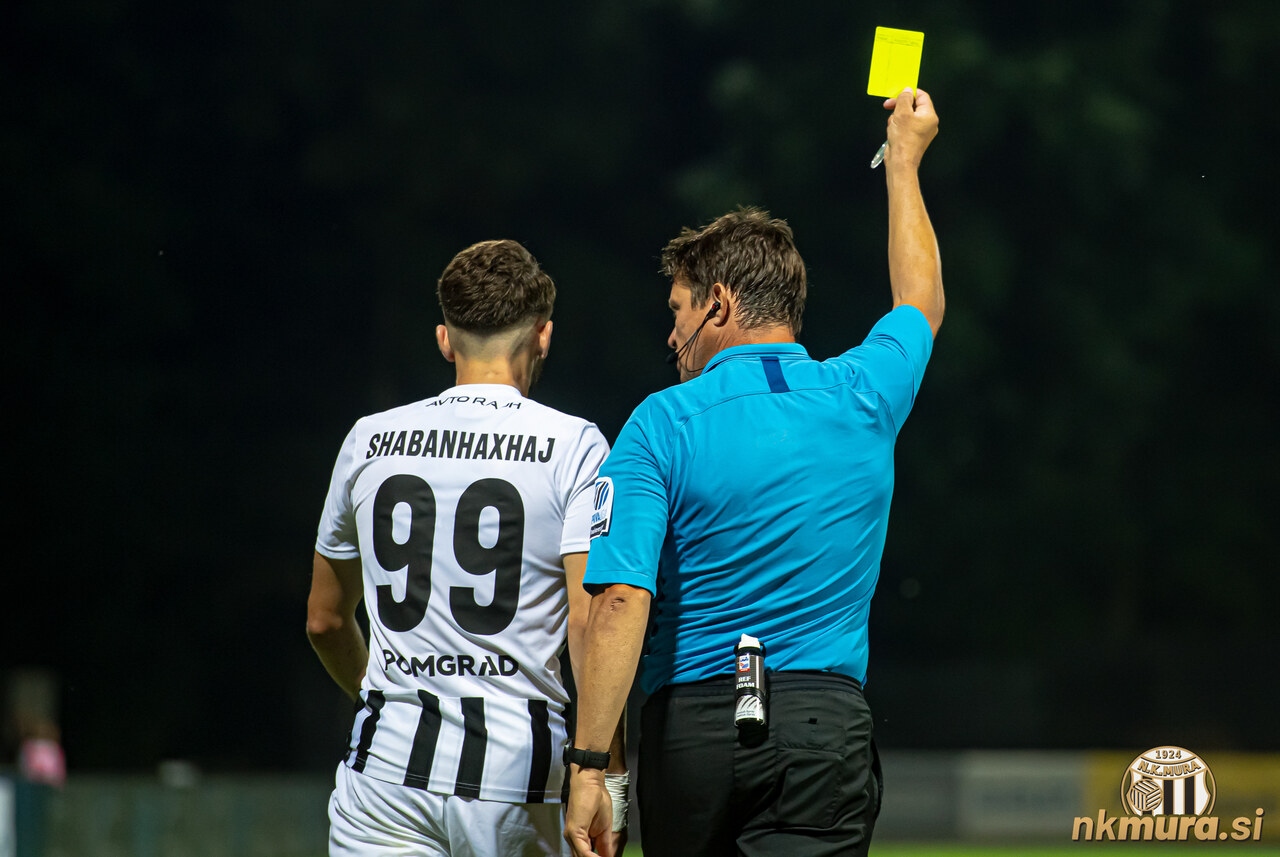 Shabanhaxhaj je prejel prvi rumeni karton v dresu Mure. Pokazal mu ga je Matej Jug. Avtorske pravice: nkmura.si Foto: Aleš Cipot/fotolens.si