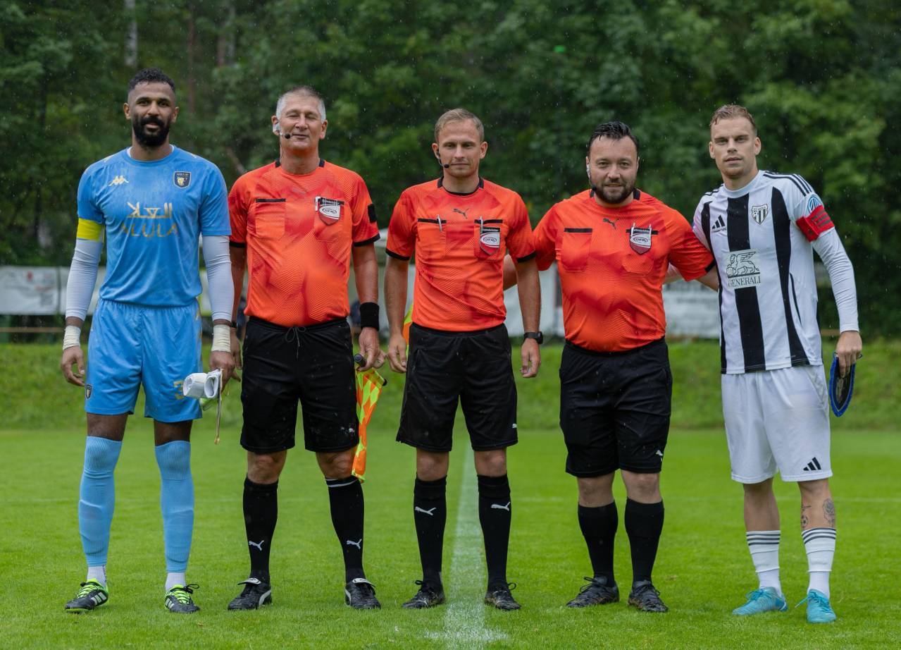 Kapetana s sodniško trojko. Skrajno desno je Aljaž Antolin. Tekma je potekala v deževnem vremenu. Foto: Al-Ula X