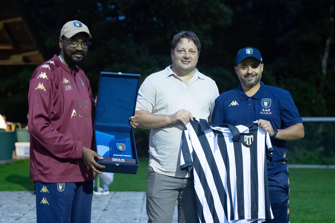 Pred pričetkom tekme sta si kluba izmenjala spominski darili. Na sredini je predsednik Mure Robert Kuzmič. Avtorske pravice: nkmura.si Foto: Al-Ula X