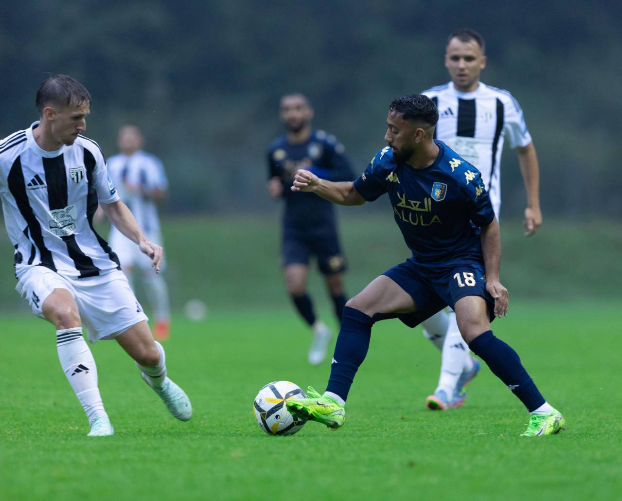 Utrinek z drugega polčasa. Edvin Krupić v dvoboju z igralcem Al-Ule. V ozadju akcijo spremlja Robert Murić. Foto: Al-Ula X