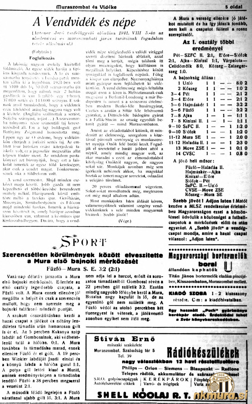 V nedeljo, 31. avgusta 1941, je Mura igrala prvo prvenstveno tekmo v Madžarskem prvenstvu. V 1. krogu južne skupine I. razreda Severno podavskega okrožja, se je v Murski Soboti pomerila s Fűzfőijem in izgubila z 2:3 (1:2).