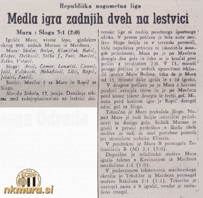 Tekma med zadnjeuvrščenima ekipama ni ponudila posebnega športnega užitka. V prvem polčasu je bilo možtvo Sloge boljše, vendar so bili napadalci skrajno neučinkoviti. V 15. minuti je glavni sodnik povsem upravičeno izključil igralca Mure Bušena, tako da je Mura skoraj celotno tekmo igrala le z desetimi igralci. Kljub vsemu so naši nogometaši v prvem polčasu dosegli dva zadetka in na odmor odšli z lepo prednostjo. Dvakrat je bil uspešen Franc Maučec.