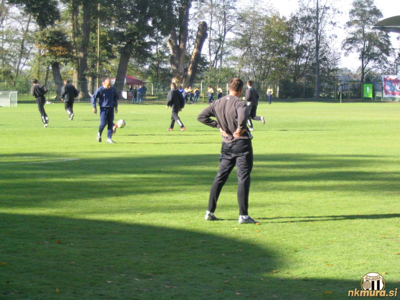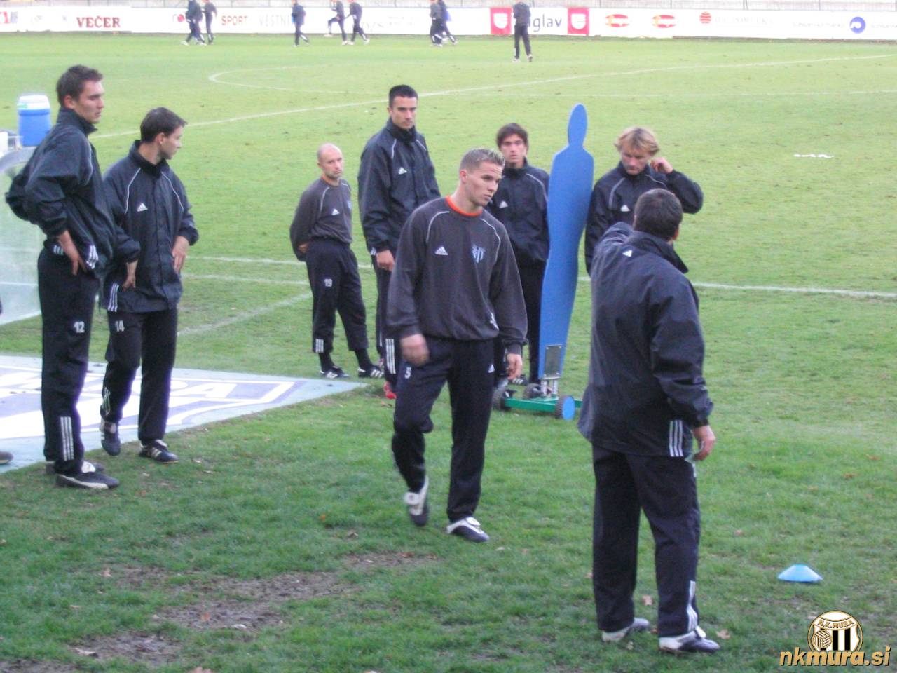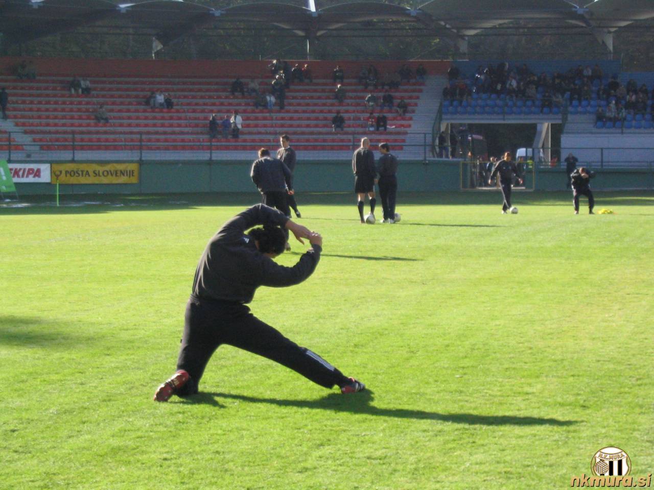Ogrevanje pred tekmo. V odpredju je vratar Nihad Pejković, k njemu pa prihaja trener vratarjev Robert Volk. Avtorske pravice: nkmura.si Foto: Simon Horvat