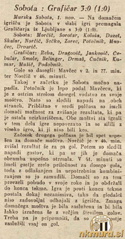 Nogometaši Sobote so po polomu v Ljubljani, v 8. krogu slovenske republiške lige gostili ljubljanski Grafičar in ga premagali z visokih 3:0 (1:0). Naši nogometaši se nahajajo na sedmem mestu prvenstvene razpredelnice.