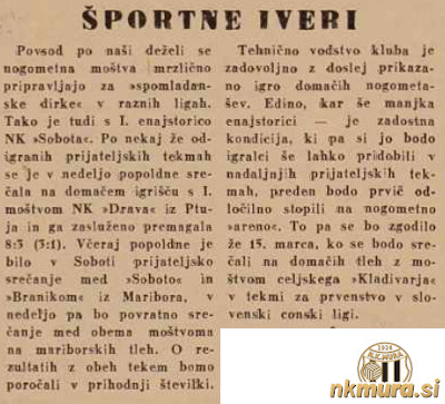 Nogometaši Sobote so v pripravljalni nogometni tekmi gostili Dravo in zmagali z 8:3 (3:1). Nasprotnika sta se pomerila že pretekli teden na Ptuju, ko je bilo 3:3.