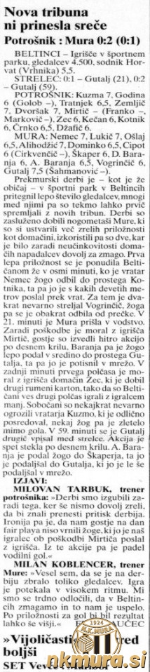 Nogometaši Mure so se v 8. krogu prvenstva v sezoni 1997/98 v Beltincih pomerili s Potrošnikom in zmagali z 0:2 (0:1). Tradicionalni prekmurski derbi si je ogledalo okrog 4500 gledalcev, prvič tudi z nove tribune.