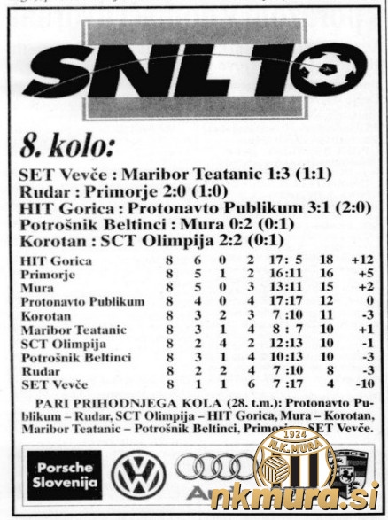 1. Hit Gorica 8 6 0 2 17:5 18 2. Primorje 8 5 1 2 16:11 16 3. Mura 8 5 0 3 13:11 15 4. Protonavto Publikum 8 4 0 4 17:17 12 5. Korotan 8 3 2 3 7:10 11 6. Maribor Teatanic 8 3 1 4 8:7 10 7. SCT Olimpija 8 2 4 2 12:13 10 8. Potrošnik Beltinci 8 3 1 4 10:13 10 9. Rudar 8 2 2 4 7:10 8 10.SET Vevče 8 1 1 6 7:17 4
