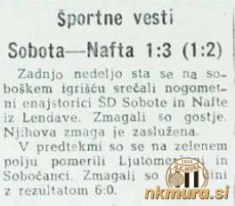 V Murski Soboti sta se v prijateljski nogometni tekmo pomerili enajsterici Sobote in Nafte. Zmagali so gostje z 1:3 (1:2). Njihova zmaga je zaslužena.
