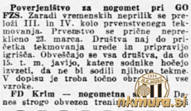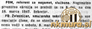 Fizkulturna zveza Slovenije (FZS) je sporočila, da je pričetek prvenstva zaradi neugodnih vremenskih razmer in zasneženih igrišč znova preložen. Prvenstveni dvoboji bi se naj nepreklicno pričeli 23. marca 1947 s petim krogom. Murska Sobota je v tem krogu prosta. FZS je obenem pozvala vsa društva, da očistijo svoja igrišča. Kdaj se bodo odigrali prvi štirje spomladanski krogi zaenkrat ni znano.