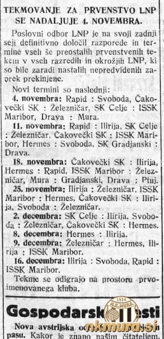 Ker so bila tekmovanja zaradi smrti kralja Aleksandra I. Karadžordževića prekinjena je bilo potrebno določiti nove termine tekem. Poslovni odbor LNP je na svoji zadnji seji določil, da se prvenstvo nadaljuje 4. novembra 1934. Mura bo takrat gostovala na Ptuju pri Dravi.