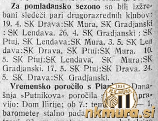 Mariborski odbor LNP je na svoji seji izžrebal pare spomladanskega dela sezone 1935/1936. Prvenstvo se nadaljuje 19. aprila 1935, Mura pa bo prvo tekmo igrala v gosteh proti Dravi.