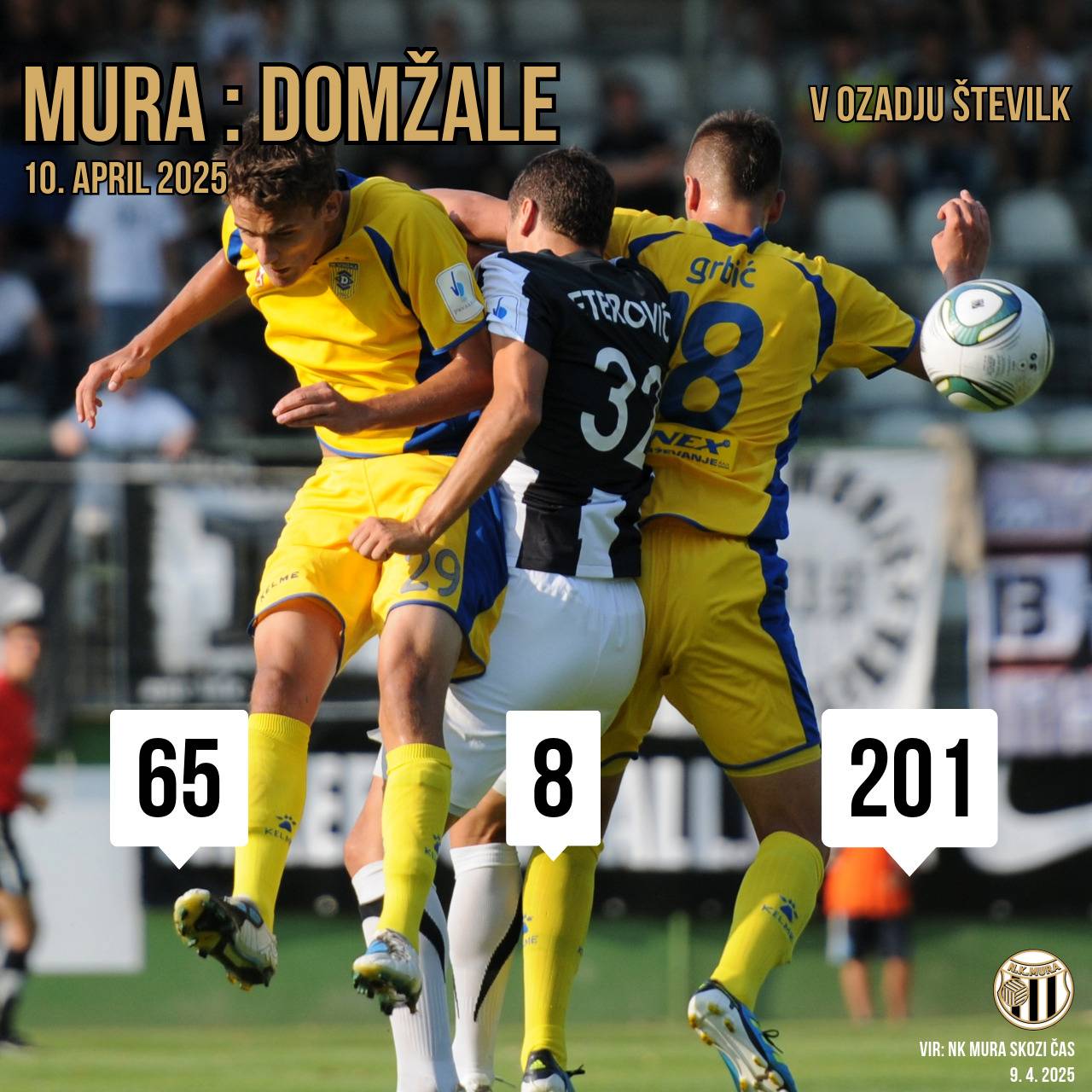 65 - Mura in Domžale sta doslej odigrala 65 prvenstvenih tekem. Črno-beli so dosegli 28, Domžale pa 18 zmag. Neodločenih izidov je bilo 19. Mura ima boljšo gol razliko, saj je dosegla 98, Domžale pa 69 zadetkov.