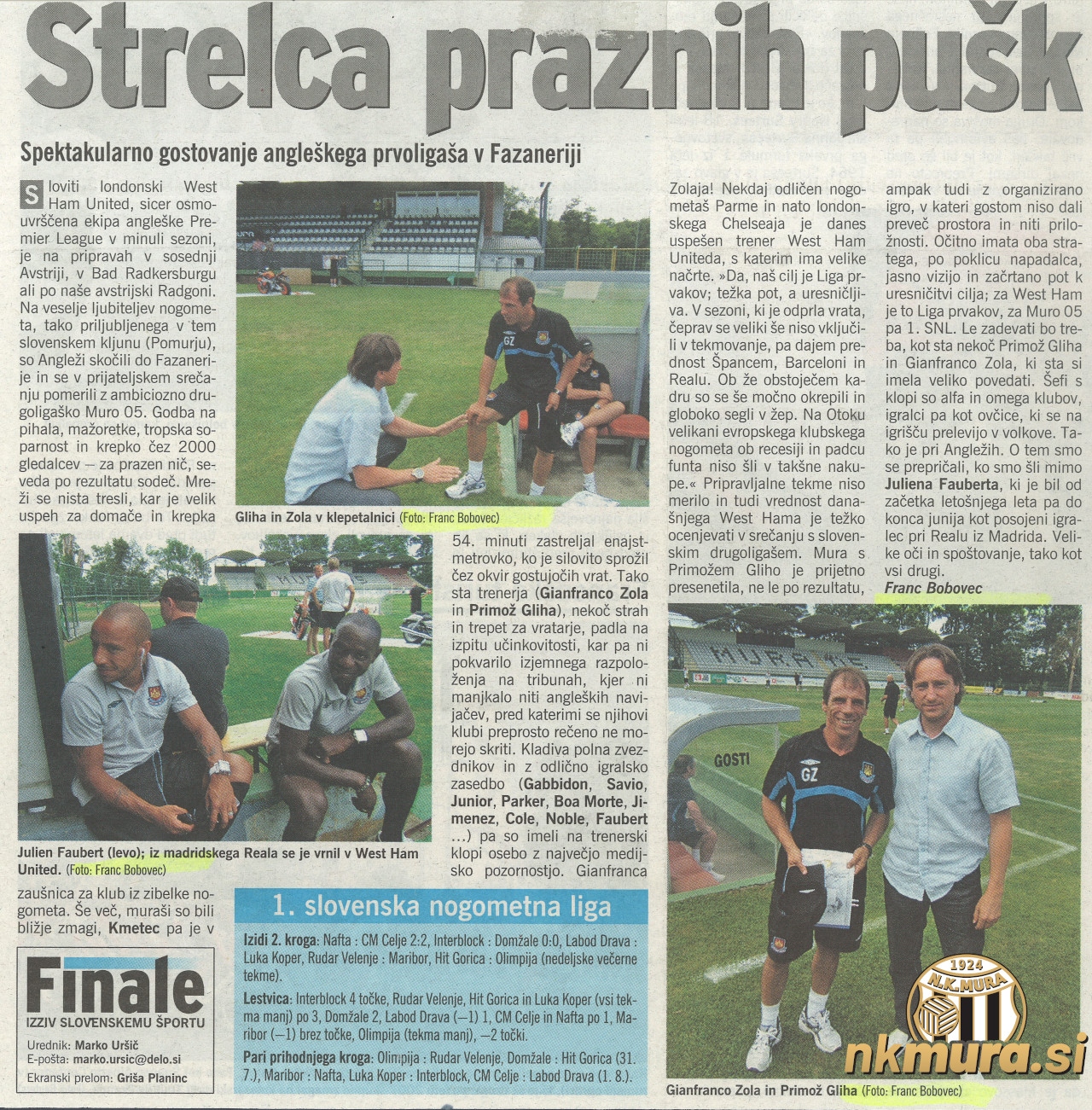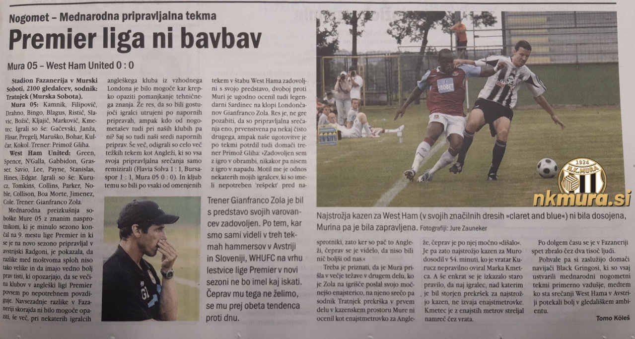 Danes ob 18.00 je bila na Fazaneriji pripravljalna nogometna tekma med Muro in angleškim premierligašem West Ham Unitedom. Po devetdesetih minutah sta se ekipi razšli brez zadetkov.