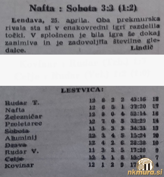 V Lendavi je bil odigran prvenstveni prekmurski derbi med Nafto in Soboto. Končal se je s 3:3, čeprav so Sobočani ob polčasu vodili z 1:2. V splošnem je bila igra dokaj zanimiva in je zadovoljila številne gledalce.