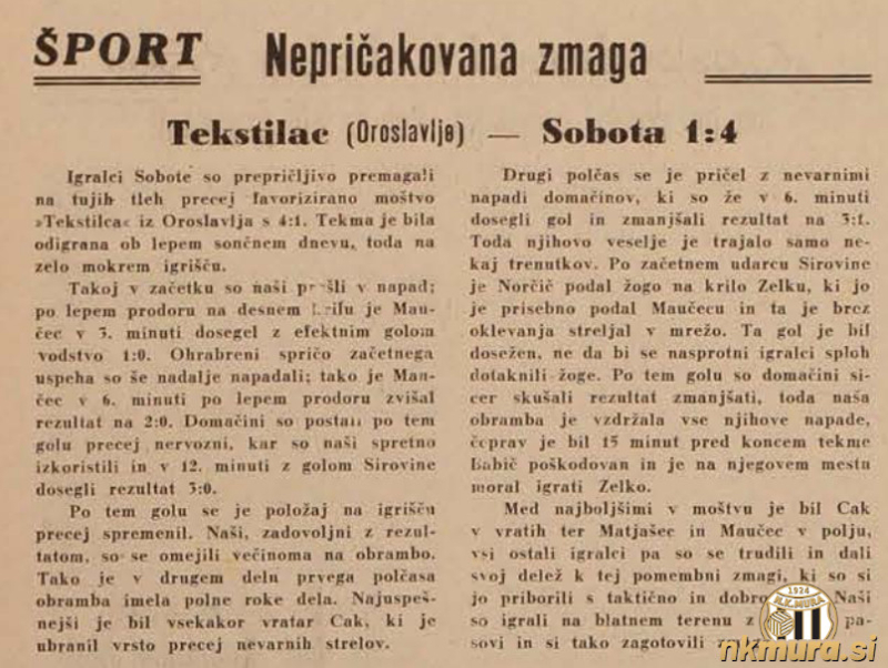 Naši nogometaši so že na začetku napadli domačine in povedli v 3. minuti. Po desni strani je prodrl Maučec in z efektnim strelom zadel za 0:1. Sobočani se niso ustavili, temveč so nadaljevali z napadalno igro. Na 0:2 je v 6. minuti znova povišal Maučec. V 12. minuti je bilo tekme praktično konec, saj je Sirovina povišal na 0:3. Po zadetku se je položaj na igrišču precej spremnil, saj so se naši nogometaši zadovoljili z visokim vodstvom in se večinoma osredotočali na obrambo. Tako se je v drugem delu prvega polčasa najbolj izkazal Zach, ki je obranil vrsto nevarnih strelov.