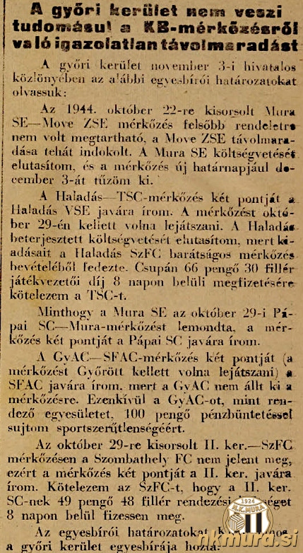 Vodstvo tekmovanja je v uradnem glasilu okraja Györ sporočilo, da tekme med Muro in Zalaegrszegom, ki bi morala biti odigrana 22. oktobra 1944, zaradi višje sile ni bilo moč izvesti. Določen je bil nove termin, t.j. 3. december.
