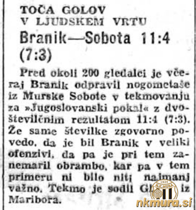 Nogometaši Sobote so v slovenskem delu pokala maršala Tita gostovali v Mariboru, kjer so se pomerili z Branikom. Mariborčani so pred 200 gledalci Soboti nasuli kar 11 golov, končni rezultat pa je bil 11:4 (7:3).