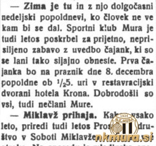 Tudi na prehodu iz leta 1937 v 1938, bo Mura organizirala čajanke. To so nedeljske družabne prireditve, na katere so vabljeni tako člani kot nečlani kluba. Prva čajanka bo 8. decembra 1937 ob 16.30 v restavracijski dvorani hotela Krona.