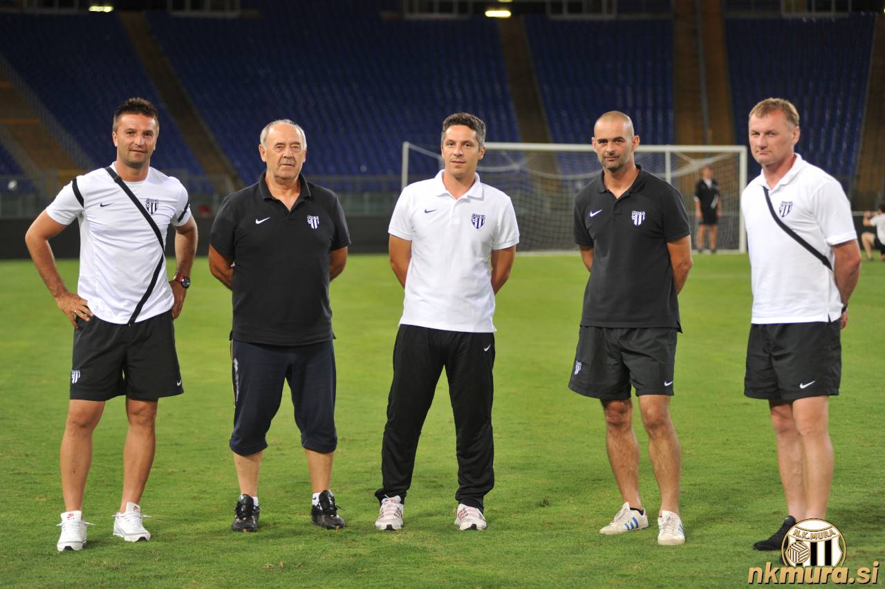 Slobodan Đurič je bil del strokovnega štaba Mure na tekmi Lazio : Mura. Od leve: Damjan Ošlaj, Slobodan Đurić, Oliver Bogatinov (trener), Sebastijan Starovasnik in Franc Cifer. Avtorske pravice: nkmura.si Foto: Nataša Juhnov