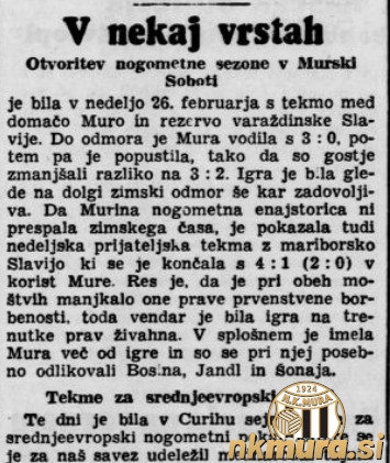 Drugo spomladansko pripravljalno tekmo v sezoni 1938/1939 je Mura igrala proti Slaviji iz Maribora ter zmagala s 4:1 (2:0). V splošnem je imela Mura več od igre, pri črno-belih pa so se najbolj odlikovali Bosina, Jandl in Šonaja.