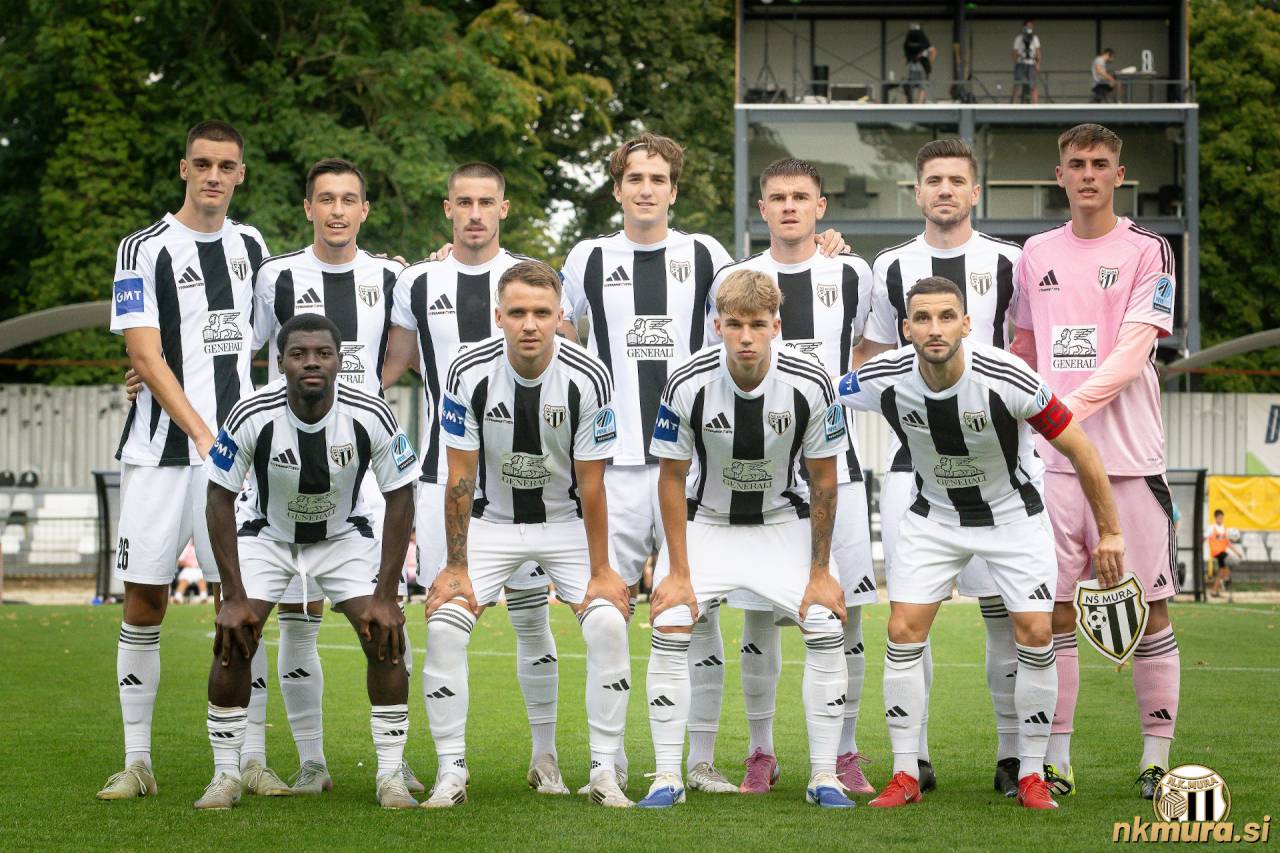 Začetna enajsterica Mure proti Domžalam (16. avgust 2025). Stojijo od leve: Proleta, Ajhmajer, Vizinger, Turudija, Bobičanec, Flis, Strajnar. Spodnja vrsta: Sana, Murić, Petrovič in Kouter. Avtorske pravice: nkmura.si Foto: Loris Cipot/fotolens.si