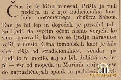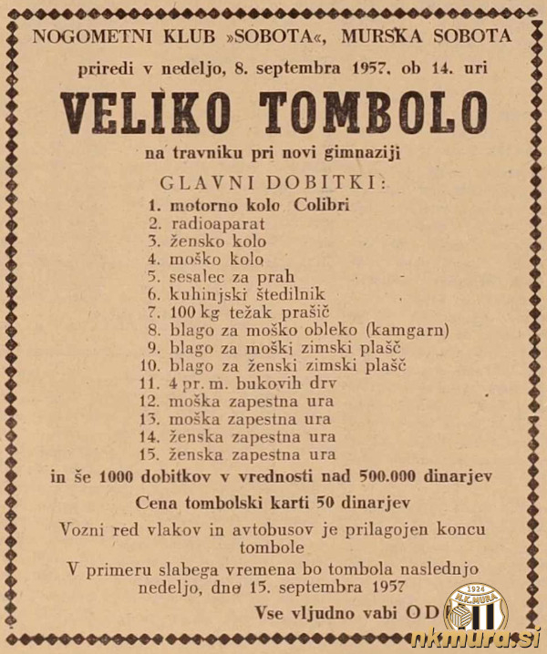 Nogometni klub Sobota je v nedeljo, 8. septembra 1957 ob 14.00, pripravil tradicionalno tombolo, ki je bila na travniku pri novi gimnaziji. Cena tombolske karte je bila 50 dinarjev, med glavnimi dobitni pa so bili motorno kolo Colibri, radioaparat, žensko in moško kolo, sesalec za prah, kuhinjski štedilnik, 100 kg težak prašič itd.