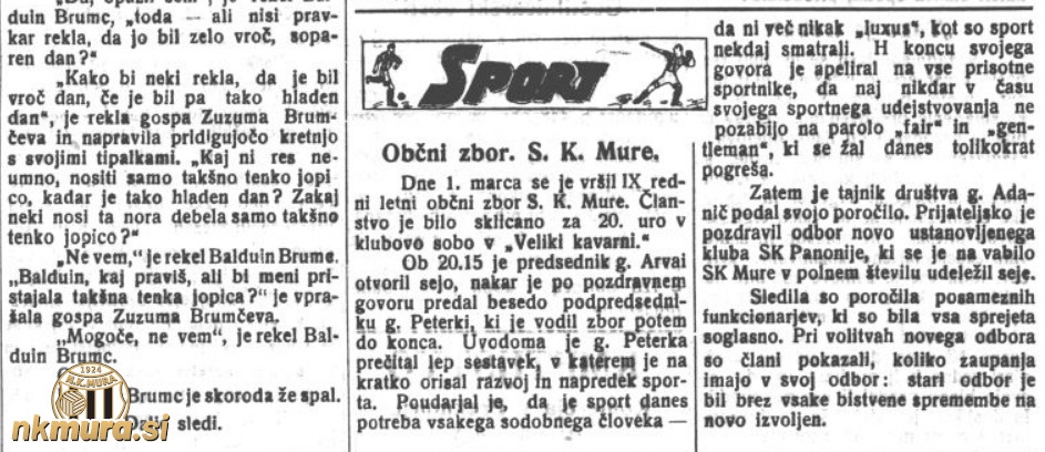 1. marca 1933 je bil v prostorih "Velike kavarne" hotela Dobrai občni zbor S.K. Mure. Za predsednika je bil znova izvoljen Vincenc Arvai, podpredsednik pa ostaja Ivan Peterka.