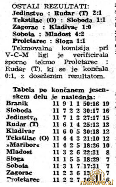 1. Branik 11 9 1 1 50:16 19 2. Sloboda 11 7 2 2 30:17 16 3. Jedinstvo 11 7 1 3 27:17 15 4. Rudar (T) 11 6 1 4 25:13 13 5. Kladivar 11 6 0 5 30:18 12 6. Tekstilac 11 4 4 3 21:10 12 7. Maribor 11 4 2 5 18:26 10 8. Mladost 11 3 2 6 22:31 8 9. Sloga 11 1 5 5 18:29 7 10.Sobota 11 3 1 7 17:31 7 11.Zagorac 11 2 3 6 12:33 7 12.Proletarec 11 2 2 7 16:32 6