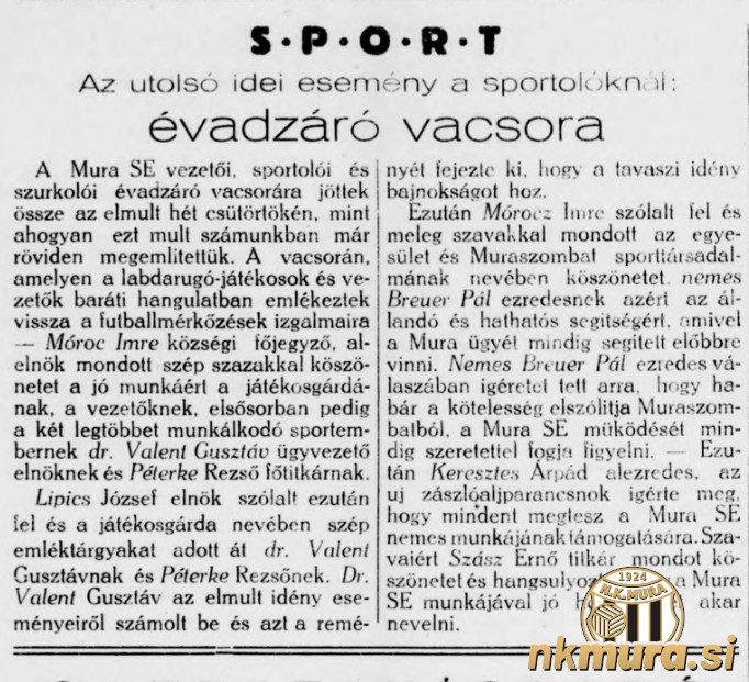 Izvršni podpredsednik in vodja nogometašev dr. Gusztav Valent je poročal o pretekli sezoni in dejal, da bo Mura storila vse, da osvoji prvenstvo v sezoni 1943/44. Zahvalo je prejel tudi polkovnik Pal Breuer, ki je vedno pomagal Muri in ki ga bo služba v prihodnje ponesla v drug kraj. Vso pomoč klubu je obljubil nov polkovnik Arpad Keresztes.